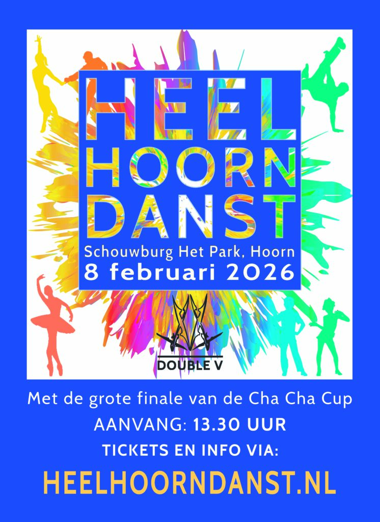 Kun je geen genoeg krijgen van al het dansspektakel? Dan is er goed nieuws! Voorafgaand aan de theatervoorstelling van onze dansschool geeft Double V nog een show: Heel Hoorn Danst met de finale van de Hoornse Cha Cha Cup. Kijk voor alle informatie op www.heelhoorndanst.nl.